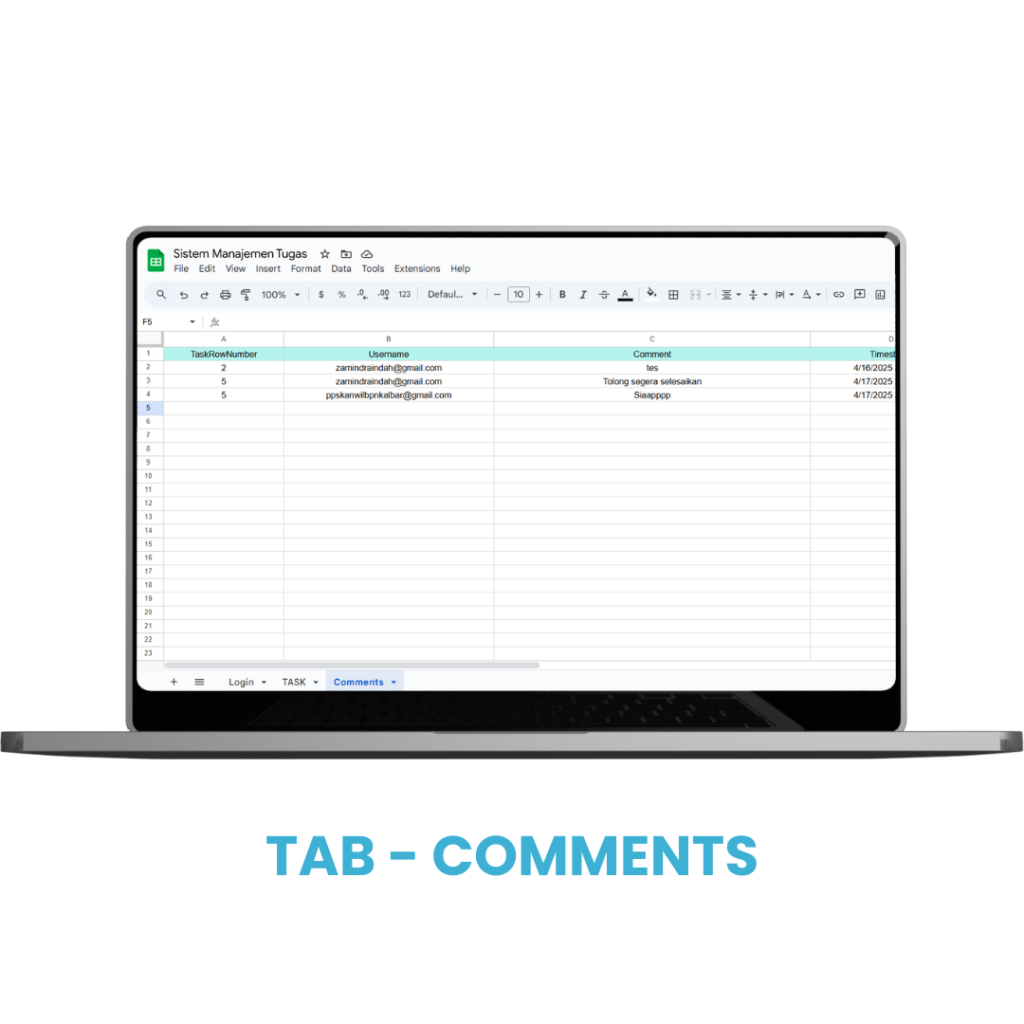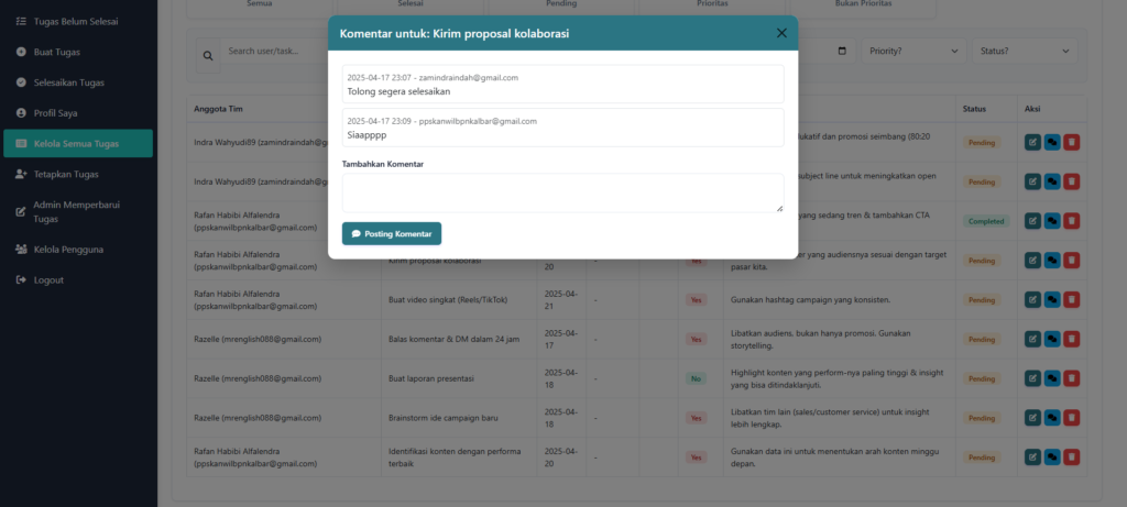 Admin dan antar pengguna dapat saling memberi komentar pada tugas yang ada